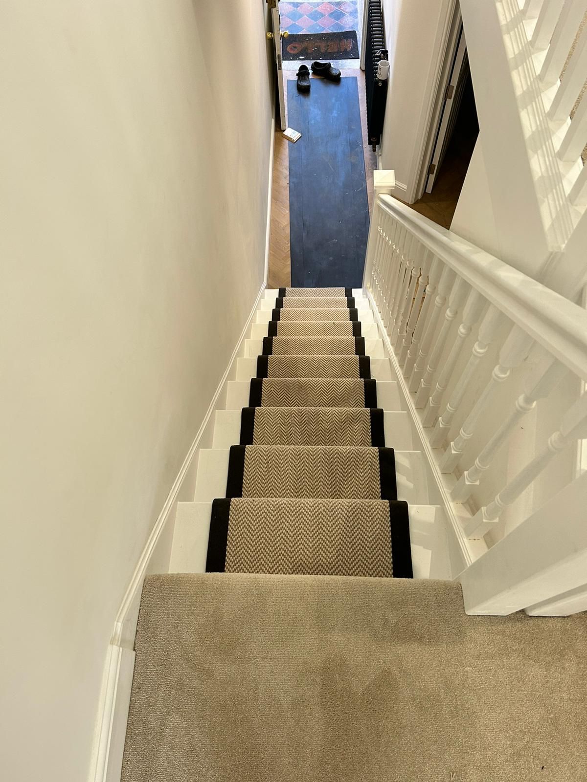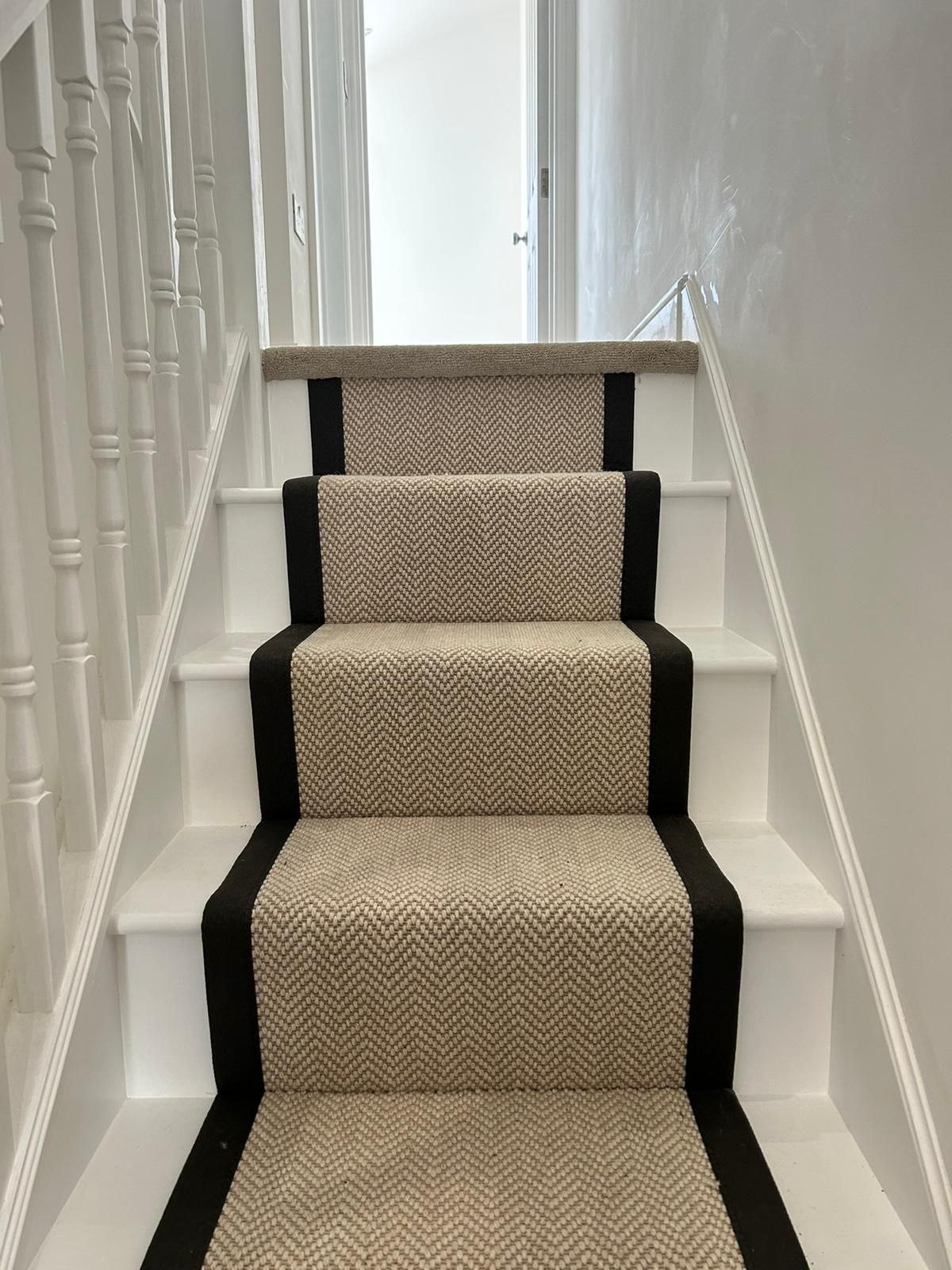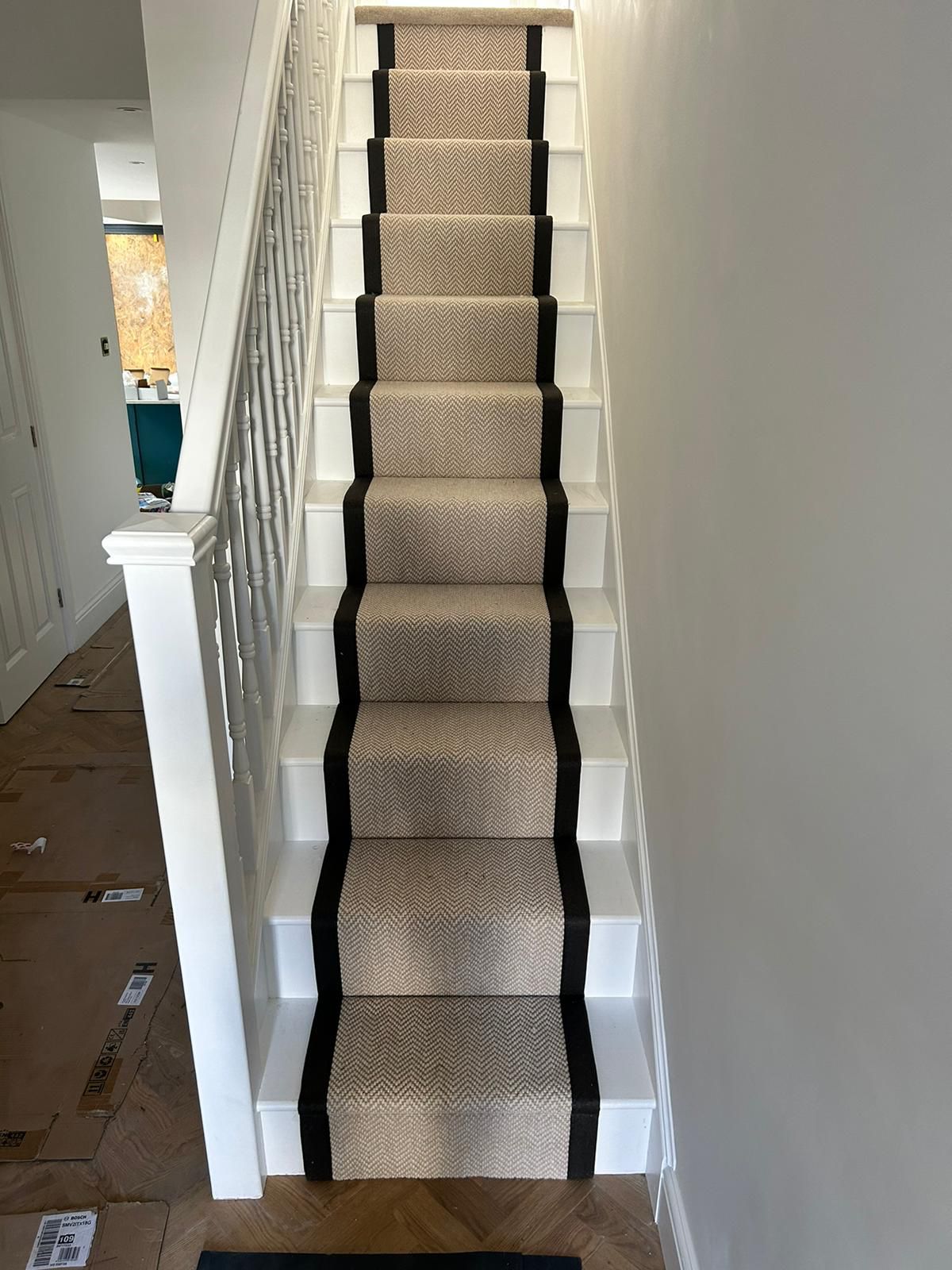 Step into elegance with our latest installation in Teddington, featuring Fibre Flooring Classic Herringbone in Chalk. This sophisticated choice, paired with a black tape stair runner and high-density underlay, brings comfort and style to your living spaces.